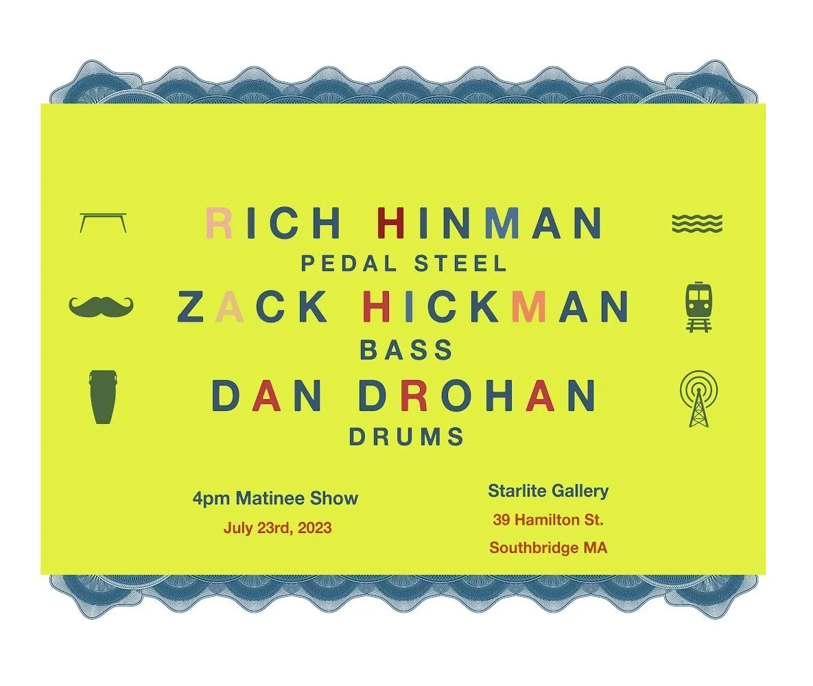 w/ Rich Hinman + Zack Hickman Sunday, July 23, 2023 4:00 PM 7:00 PM 16:00 19:00 Starlite 39 Hamilton Street Southbridge, MA, 01550 United States (map) Google Calendar ICS